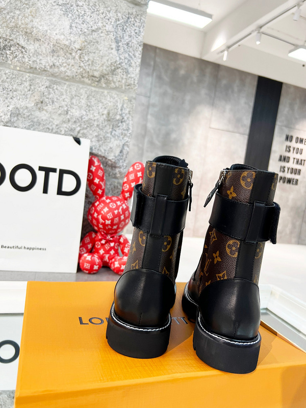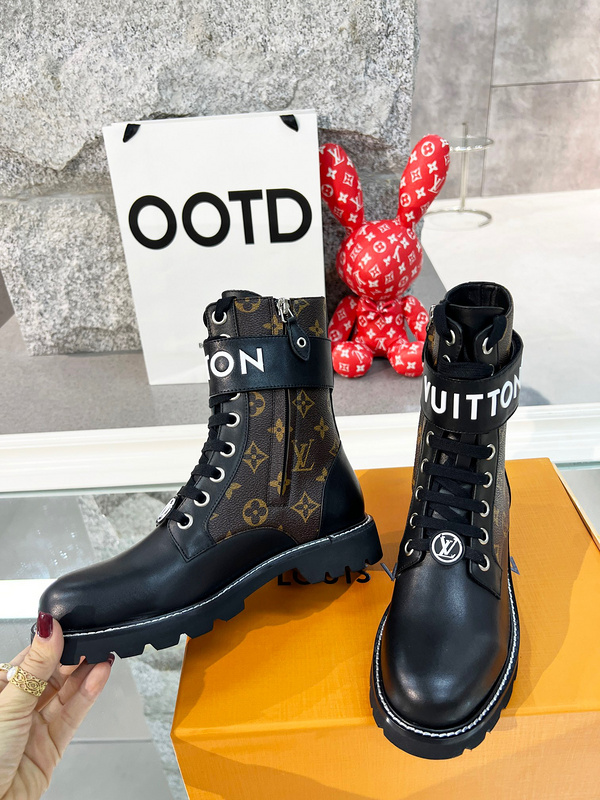 新品发布会 LV平底靴采用小牛皮碰撞橡胶元素:Louis Vuitton 标识点缀可调节魔术贴,LV Circle 标识栖身长鞋带。面橡胶外底延续军靴设计,搭配 Monogram 帆布鞋舌和便于穿脱的侧拉链,3色任选(35-40码) TX1193310