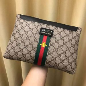 Gucci Men’s Brown GG Supreme Clutch with Green and Red Web and Bee $198.00