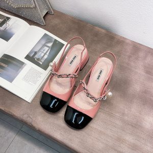 MiuMiu 21早春新款粗跟玛丽珍珠链条单鞋凉鞋 60年代撞色设计风格鲜明 。 鞋面采用牛漆皮,内里垫脚小羊皮,意大利进口真皮大底。 跟高:4.5cm 颜色:两色 码数:35–40(40订做不退不换)配原版包装 TX1255290