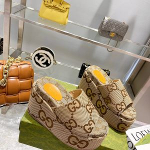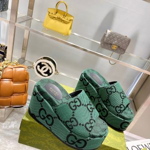 2022年Gucci官网最新款高版本限量款,厚底坡跟拖鞋 。顶级品质发售 购入正品开发 . 材质.工艺与原版一致 鞋面:原版提花工艺 内里:混种羊皮 大底:意大利私模橡胶大底 码数:35-40码 ,(41.42 码可订做) 底厚:前掌: 7cm 后跟: 12cm 颜色:绿色,杏色,两个颜色可选 CX105260