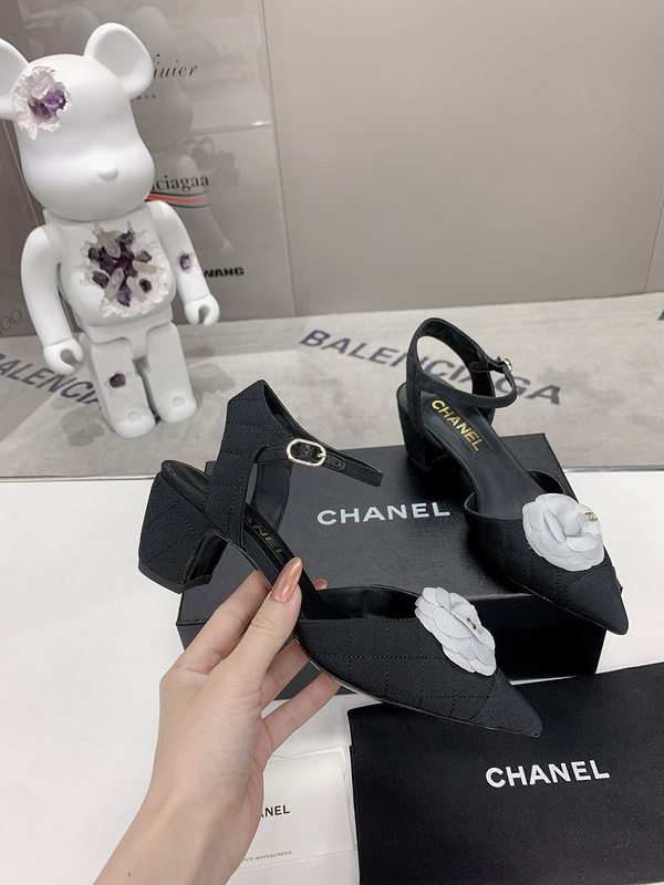 布面跟高5cm / Chanel 山茶花后空凉鞋 / 鞋面-进口小羊皮 内里-垫脚混种羊皮 高跟-5cm / 码数:35-40 ● 超好看的山茶花凉鞋 精致又经典 好打理 经典复古 优雅好搭配!● TX1255320