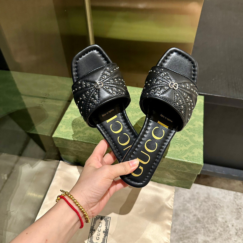 GUCCI 古驰 高跟鱼嘴凉拖鞋,面料装饰铆钉Logo超级百搭,颜色:黑、白、蓝.玫红、苹果绿。码数5-41 cx138240