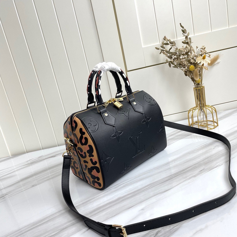 LV Black Leather Speedy Bag with Leopard Print Panel