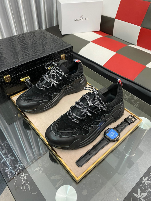Moncler Men’s Sports Casual Shoes Made with top-layer cowhide combined with breathable mesh fabric, offering excellent flexibility and strong wrinkle resistance for durability. Features small black, white, and red woven accents, with a rubber logo badge on the tongue. Simple and casual design with breathable mesh lining and cowhide insole for dryness, sweat absorption, and breathability. Original TPU combined outsole. Available sizes: 38-46. Model: TB908280.