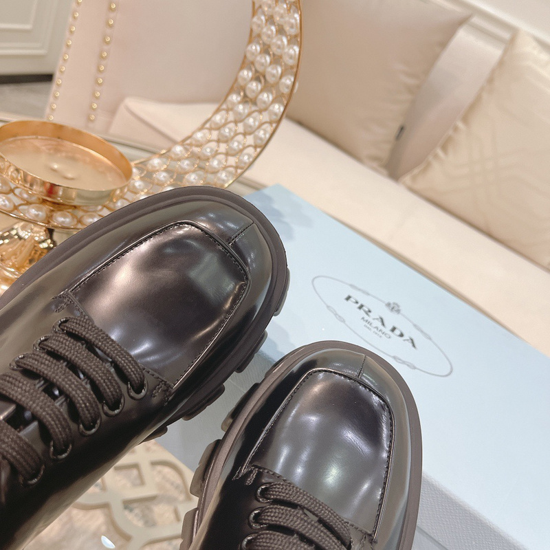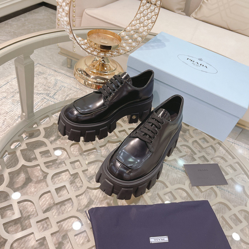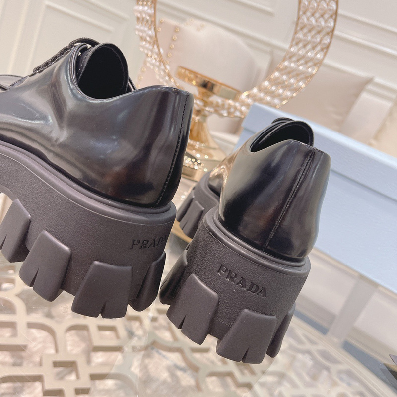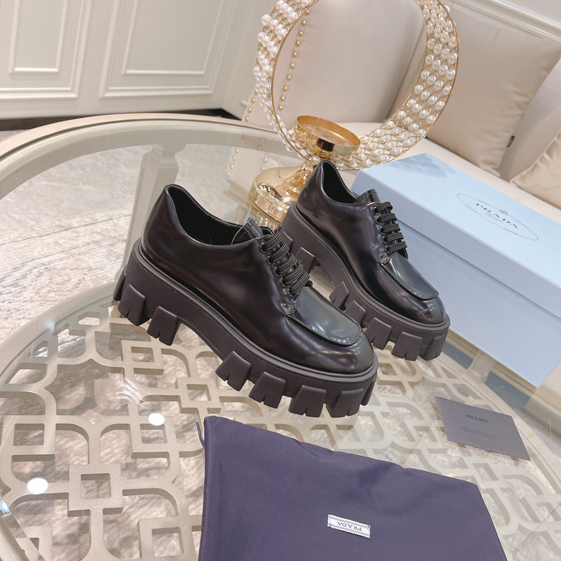 Prada-Monolith 亮面小牛皮系带鞋乐福鞋 这款亮面皮革系带鞋的鞋帮灵感源于Prada的典藏复古风格,对比鲜明的块状鞋底定义设计格调,鞋帮配鞋头盖绲边和涂珐琅孔眼,鞋舌热印徽标,采用聚酯纤维鞋带。 5.5cm高橡胶大底,鞋底块状花纹尽彰显个性,此款更是为小个子女生量身定做,休闲又活泼,穿上它大长腿非你莫属! size: 35-40 TX1294260