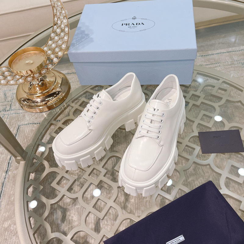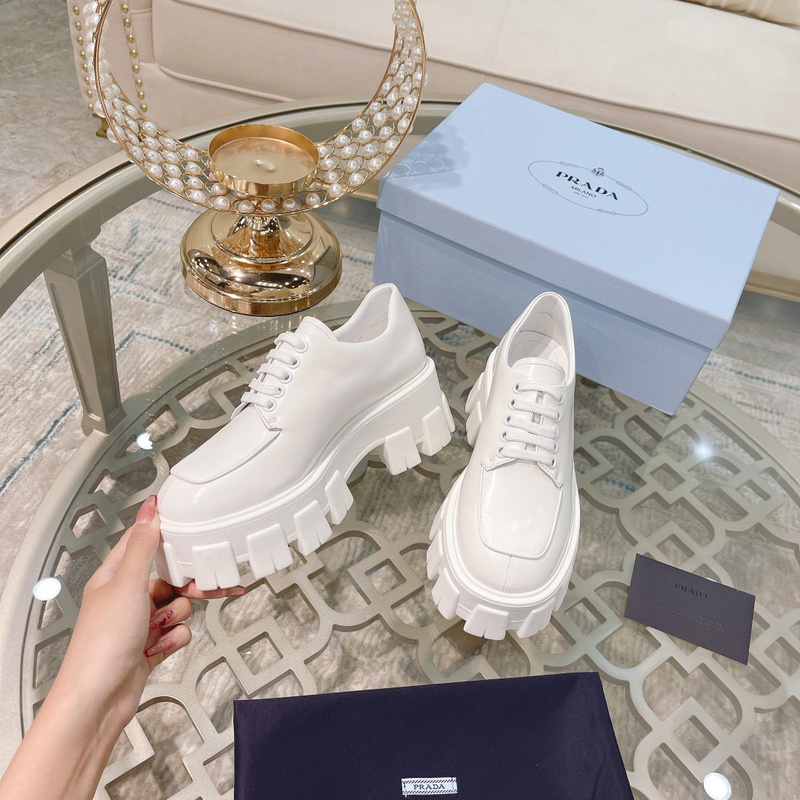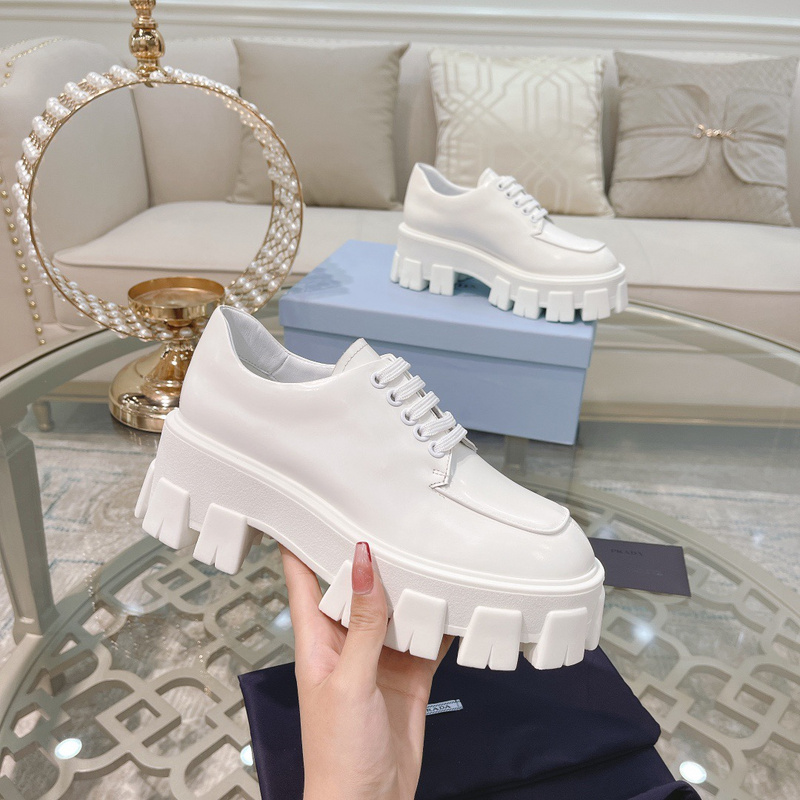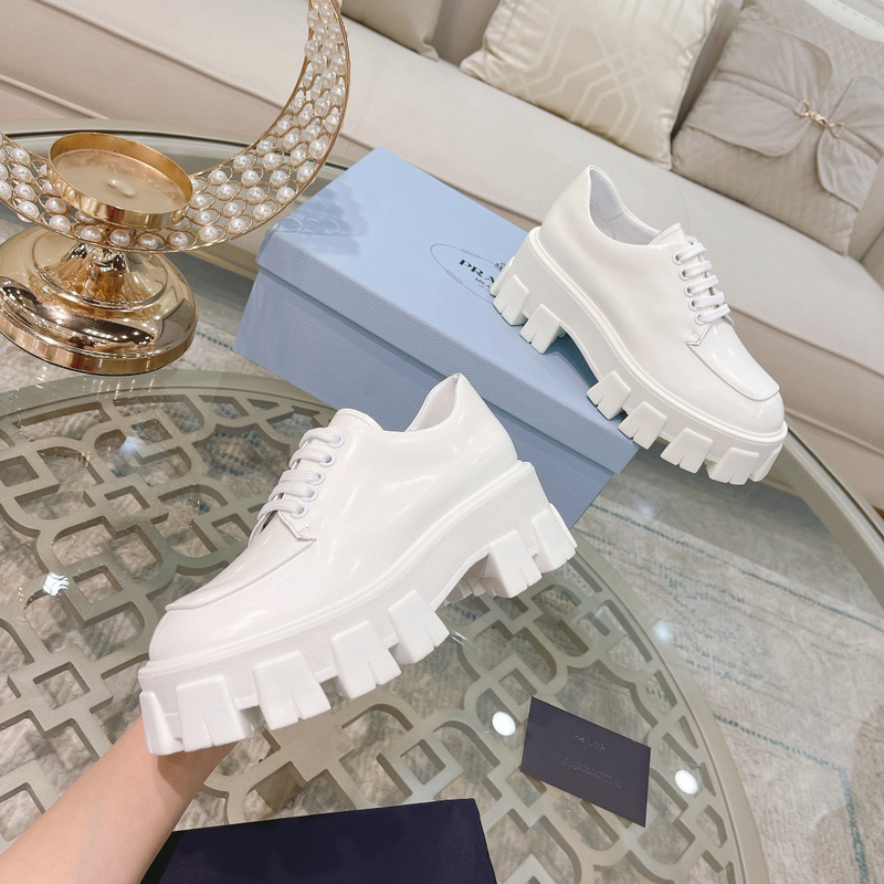 Prada-Monolith 亮面小牛皮系带鞋乐福鞋 这款亮面皮革系带鞋的鞋帮灵感源于Prada的典藏复古风格,对比鲜明的块状鞋底定义设计格调,鞋帮配鞋头盖绲边和涂珐琅孔眼,鞋舌热印徽标,采用聚酯纤维鞋带。 5.5cm高橡胶大底,鞋底块状花纹尽彰显个性,此款更是为小个子女生量身定做,休闲又活泼,穿上它大长腿非你莫属! size: 35-40 TX1294260