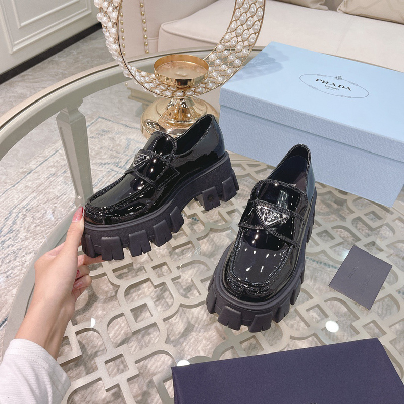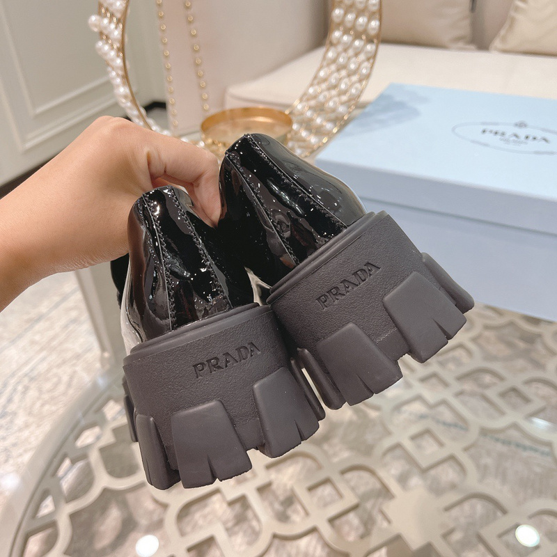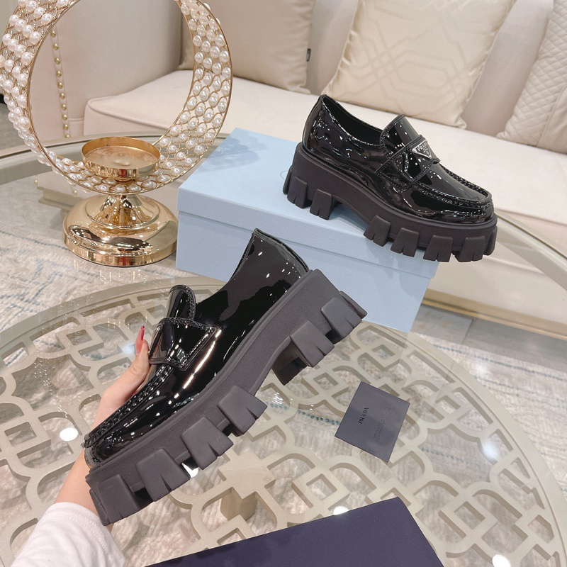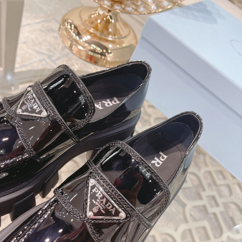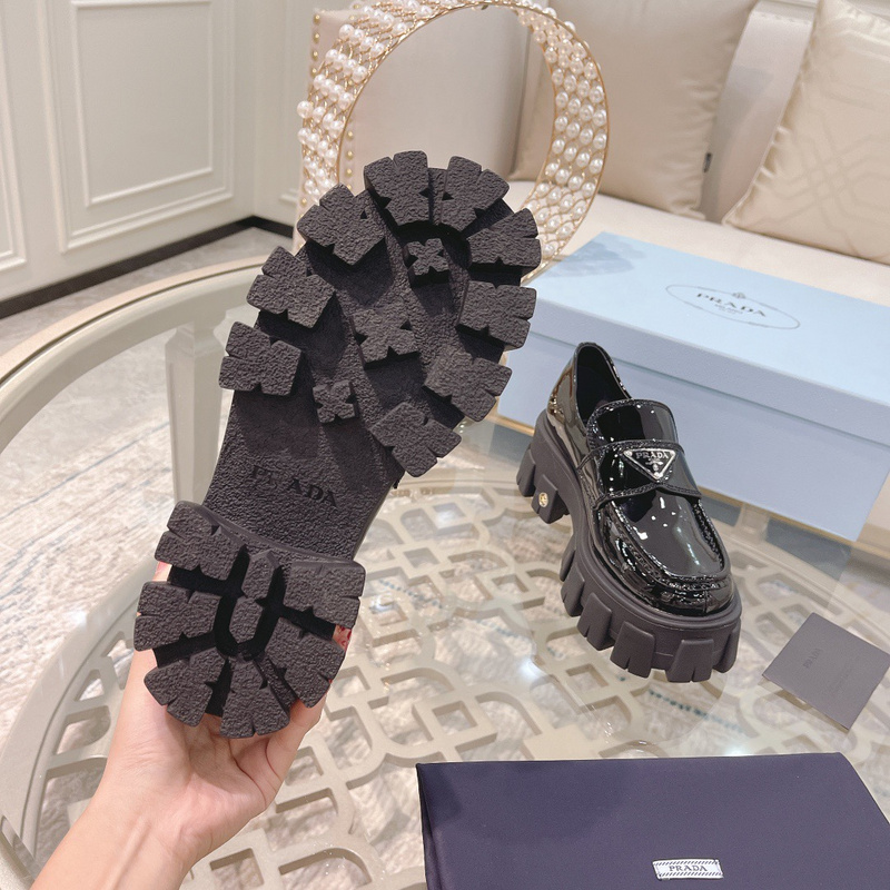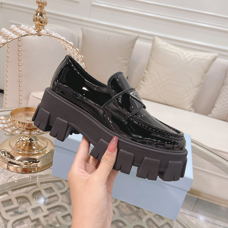 Prada-Monolith 亮面皮革三角扣轮胎厚底乐福鞋 这款亮面皮革乐福鞋呈中性风格,鞋身采用Oversize廓形设计,饰以精美细节。轮胎凸纹厚底与涂珐琅三角形徽标装饰展现品牌设计格调。鞋面配皮革饰带+涂珐琅金属三角形徽标+羊皮内里,5.5cm多孔橡胶鞋底,呈轮胎凸纹鞋底,更彰显个性。 size: 35-40 TX1294300