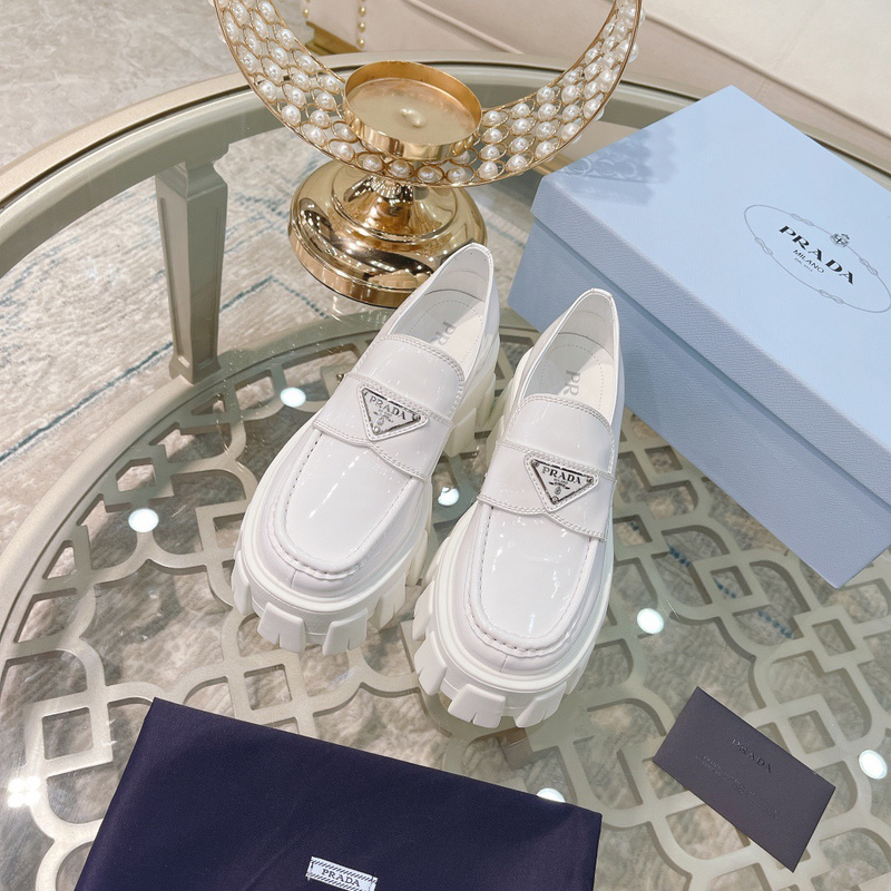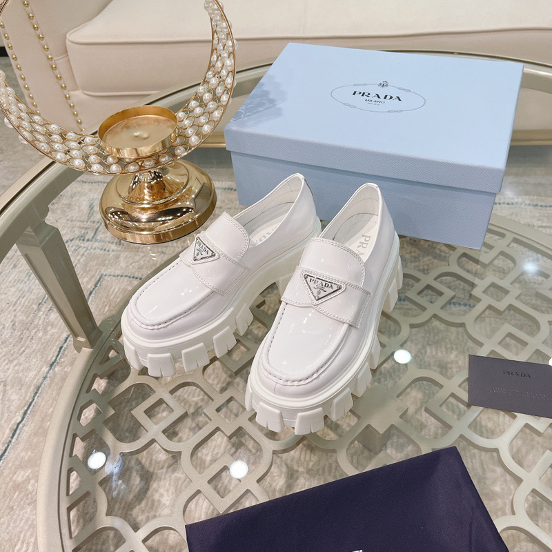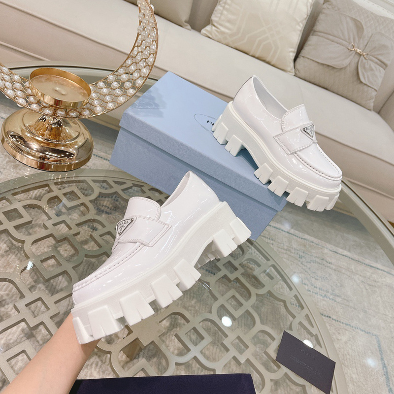 .Prada-Monolith 亮面皮革三角扣轮胎厚底乐福鞋 这款亮面皮革乐福鞋呈中性风格,鞋身采用Oversize廓形设计,饰以精美细节。轮胎凸纹厚底与涂珐琅三角形徽标装饰展现品牌设计格调。鞋面配皮革饰带+涂珐琅金属三角形徽标+羊皮内里,5.5cm多孔橡胶鞋底,呈轮胎凸纹鞋底,更彰显个性。 size: 35-40 TX1294300