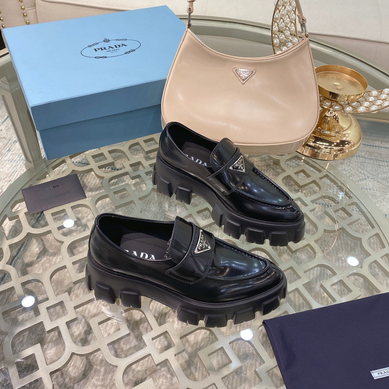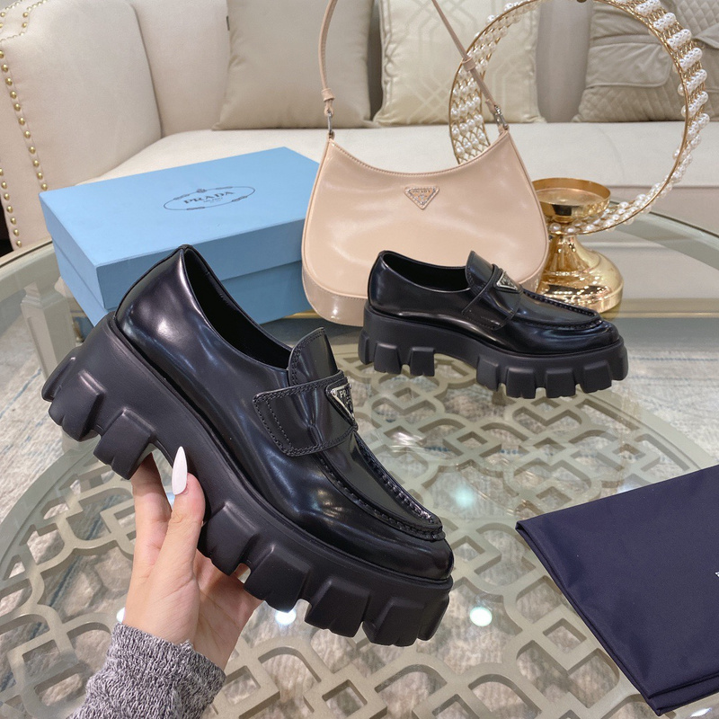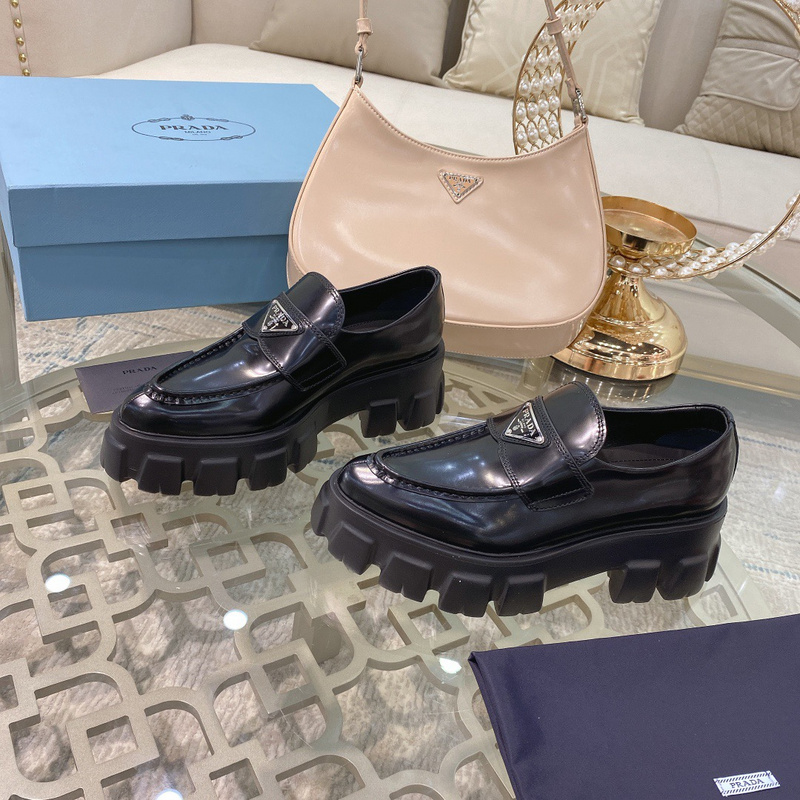 Prada-Monolith 亮面皮革三角扣轮胎厚底尖头乐福鞋 这款亮面皮革乐福鞋呈中性风格,鞋身采用Oversize廓形设计,饰以精美细节。轮胎凸纹厚底与涂珐琅三角形徽标装饰展现品牌设计格调。鞋面配皮革饰带+涂珐琅金属三角形徽标+羊皮内里,5.5cm多孔橡胶鞋底,呈轮胎凸纹鞋底,更彰显个性。 size: 35-40码 TX1294290