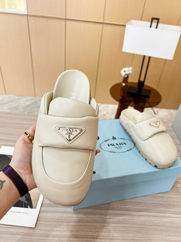 厚底款! Prada 普拉达 2023新春夏款面包包头拖鞋 胖嘟嘟的 超可爱 上脚舒服 超级耐看 简约大气 经典三角扣时尚不过时 懒人款 随意穿搭 必备款 材质:羊皮面,内里羊皮 码数35-40 TX907280